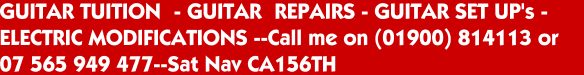 Hi there, and a very warm welcome to my website. My name is John Forster and I teach and repair guitar's. I also repair keyboards, banjo's, mandolin's etc. I am based just outside of Maryport in Cumbria.If you are not familiar with my company and your first contact with me is online, I would be pleased to hear from you!. Please let me know what your needs or questions are and I will be more than happy to help.