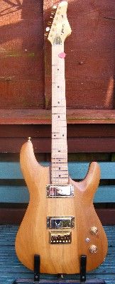 This is my latest creation. I don't know why I made it because I have quite a few guitars, but it's sure better than painting and decorating!!! I made the body out of Tulip wood which to be honest I'd never come across before but it was really good to work with and has a lovely feel to it. I just gave it a oil finish and it's as smooth as a baby's botty! Not that I go around rubbing baby's botty's but you know what I mean. I fitted two P90 type pick-up's with a single volume and tone control and it sound's and plays fabulous.